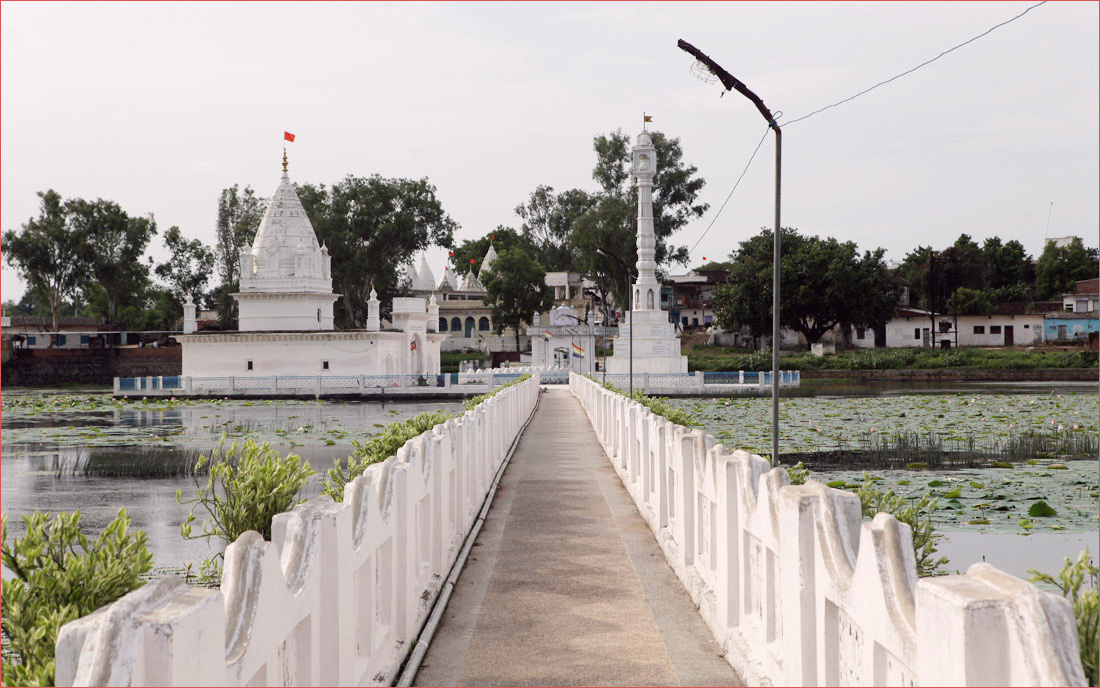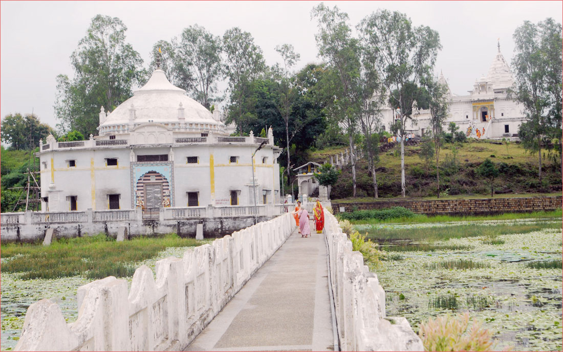 एक विशाल सरोवर के मध्य में एक भव्य जल मंदिर बना हुआ है। मंदिर तक जाने के लिये पुल है। सरोवर